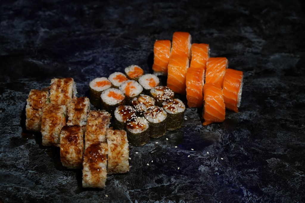 Ролл "Бонито" 8шт (рис, сливочный сыр, охлажденный лосось, копченый угорь, огурец)