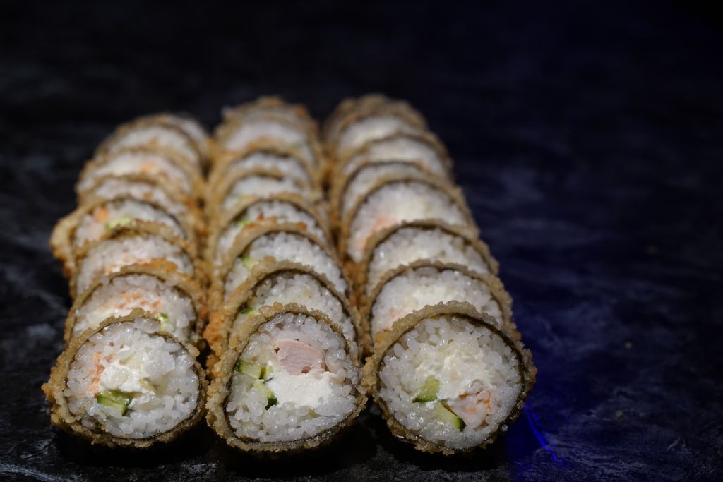 Темпура с лососем 8шт (рис, сливочный сыр, свежий лосось, огурец, темпур)