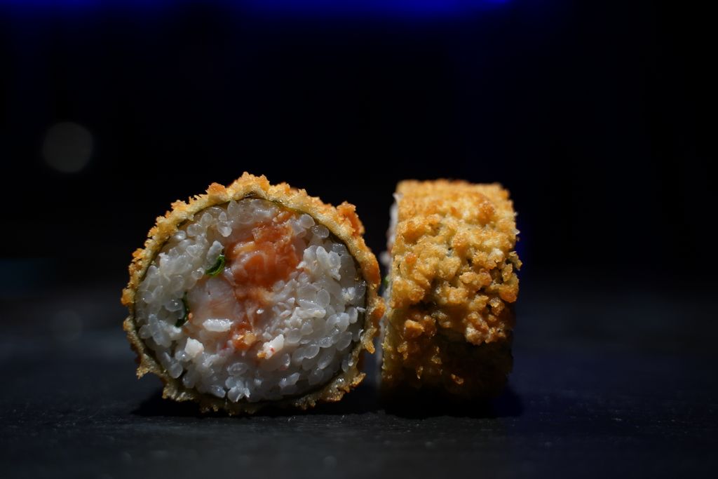 рис, нори, тигровая креветка, лосось, снежный краб, зеленый лук, темпур