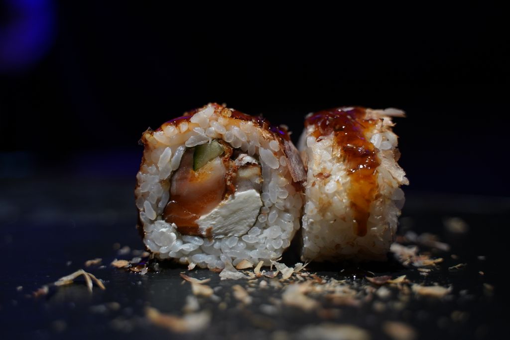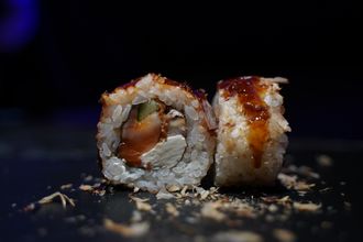 рис, сливочный сыр, огурец, копченый угорь, свежий лосось, стружка тунца, соус унаги