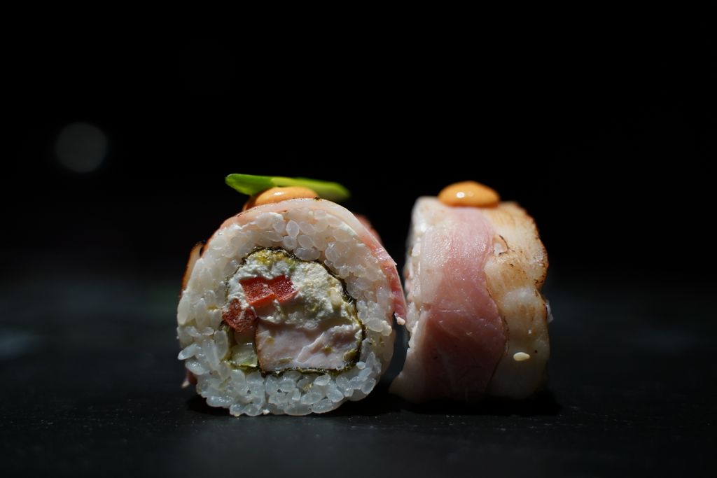 рис, сливочный сыр, копченая курица, болгарский перец, зеленый лук, опаленный бекон, соус спайси
