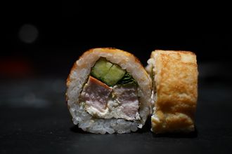 рис, сливочный сыр, огурец, зеленый лук, копченая курица, блинчик