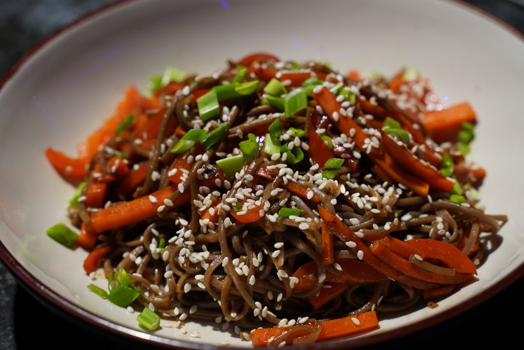 рисовая лапша, морковь, болгарский перец, лист салата, фирменный соус, зеленый лук, кунжут