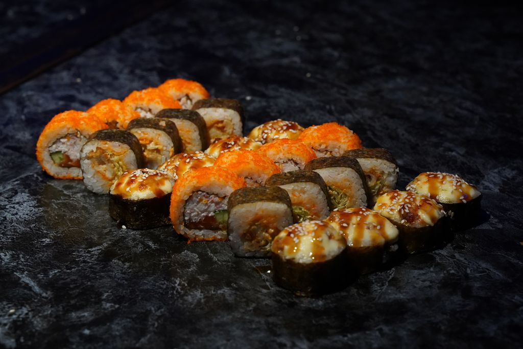 Ролл "Запеченный с угрем" 8шт (рис, японский омлет, сливочный сыр, лист салата, копченый угорь, майонез)