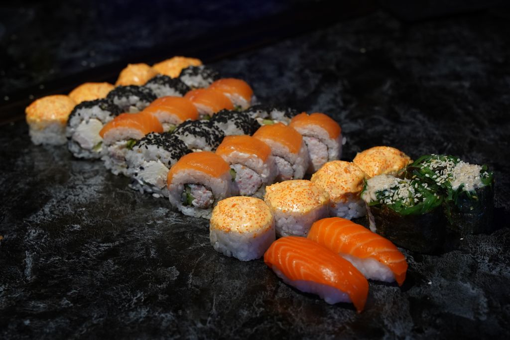 Ролл "Черная молния" 8шт (рис, сливочный сыр, огурец, копченая курица, черный кунжут)