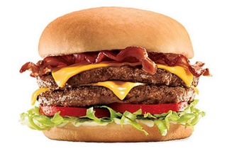 двойная котлета из говядины, томаты, фирменный соус BBQ, свежие огурцы, лист салата, бекон, сыр чеддер, булочка