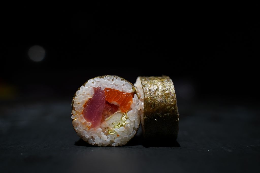 рис, свежий лосось, тунец, томат, лист салата, соус спайси, нори