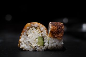 рис, сливочный сыр, огурец, блинчик, соус унаги, кунжут