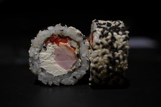 рис, сливочный сыр, болгарский перец, лист салата, копченая курица, кунжут