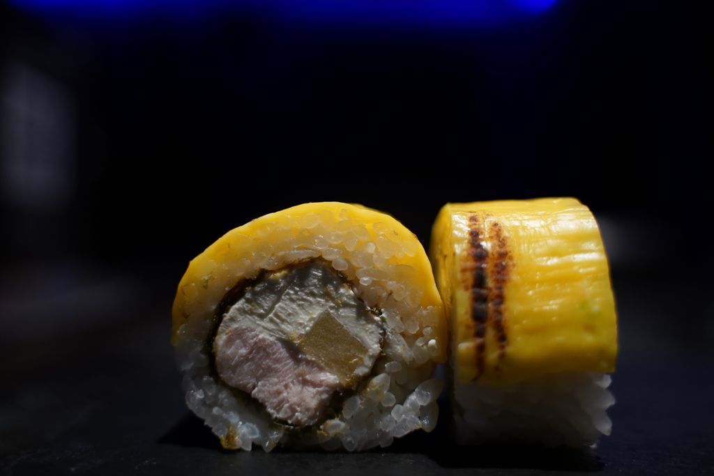рис, нори, творожный сыр, копченая курица, маринованные ананасы, сыр "чеддер"